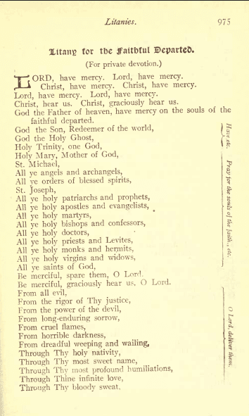 Pray for the faithful departed with this traditional Catholic Litany from Fr. F.X. Lasance’s Prayer Book for Religious. Offer intercessions for souls in Purgatory, gain indulgences, and participate in a timeless devotion aiding their holy repose.